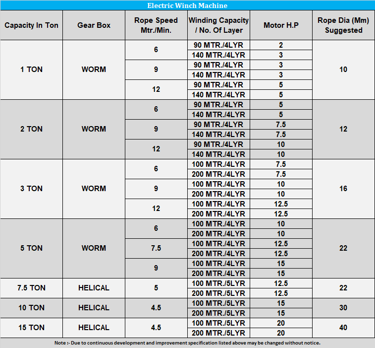 | Capacity In Ton | Gear Box | Rope Speed Mtr./Min. |